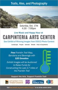 Please join the Santa Barbara County Trails Council and the Friends of Franklin Trail in a toast to the winners of the 93013 Photo Contest on October 17th, 2015 from 4:30-7:00 pm at the Carpinteria Arts Center for an awards ceremony and fundraiser for Phase III of the Franklin Trail. Over a dozen award-winning photographers will be honored at an open-air exhibit of their work. The large-format prints will be silently auctioned to raise funds for the Franklin Trail. All donations will be matched, dollar for dollar, by the Santa Barbara Sierra Club Chapter up to $10,000.