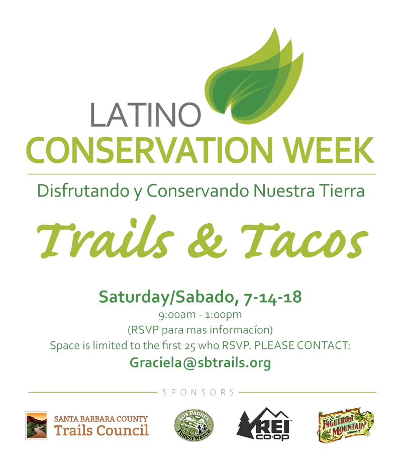 This year, Santa Barbara County Trails Council and Los Padres ForestWatch are organizing a TRAILS & TACOS hike as part of Latino Conservation Week. Additional sponsors include REI Co-Op and Figueroa Brewing. To join in on the fun, contact Graciela Cabello for more information about the July 14th event and to reserve your spot. Please make sure to RSVP by Thursday, July 12th. The event is limited to 25 people.