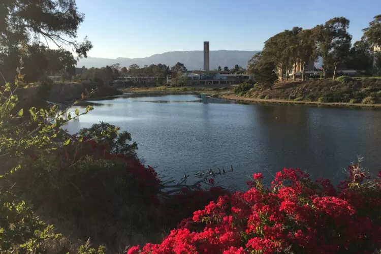 The gateway to the lagoon trail is at the end of Lagoon Road on the east side of the UCSB campus. Parking fees are required for designated coastal access parking spots. The trail along the north side of the lagoon is paved, while the south side is a combination of dirt, sand, and paved surfaces. The 1.5-mile loop walk takes hikers past a popular beach, a noted surfing area at Campus Point, and across the coastal bluffs. Make sure to seek out the Lagoon Labyrinth, a circular path defined by river rocks and designed to be a reflective and serene walk. Following the circular route will add 6/10s of a mile to your hike.